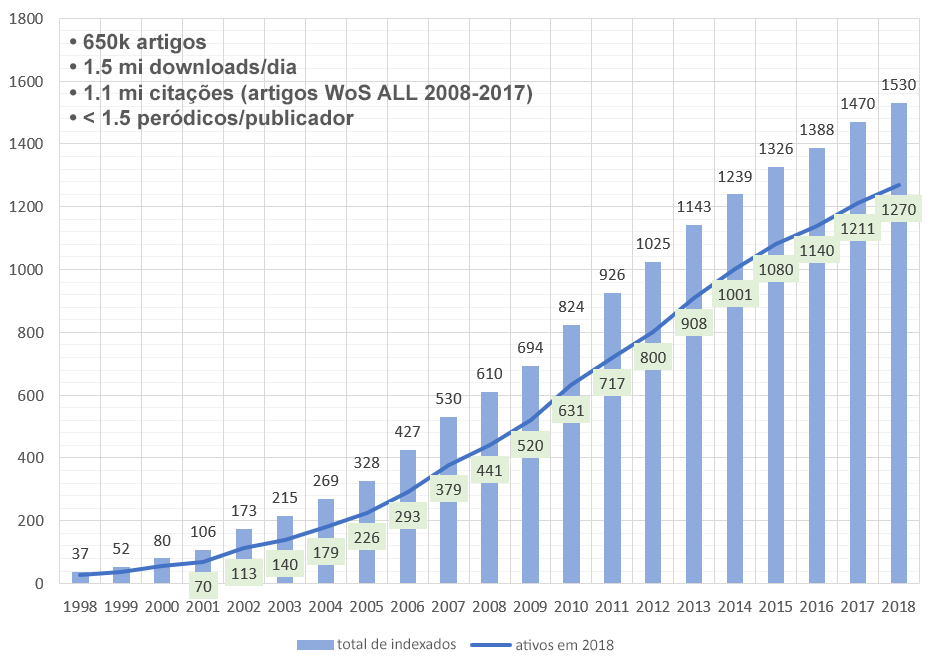 Figura 1. Rede SciELO – evolução do número de periódicos indexados e ativos por 14 coleçõesnacionais certificadas, entre 1997 e 2018. Fonte: SciELO/PACKER, A.L., Agosto/2018